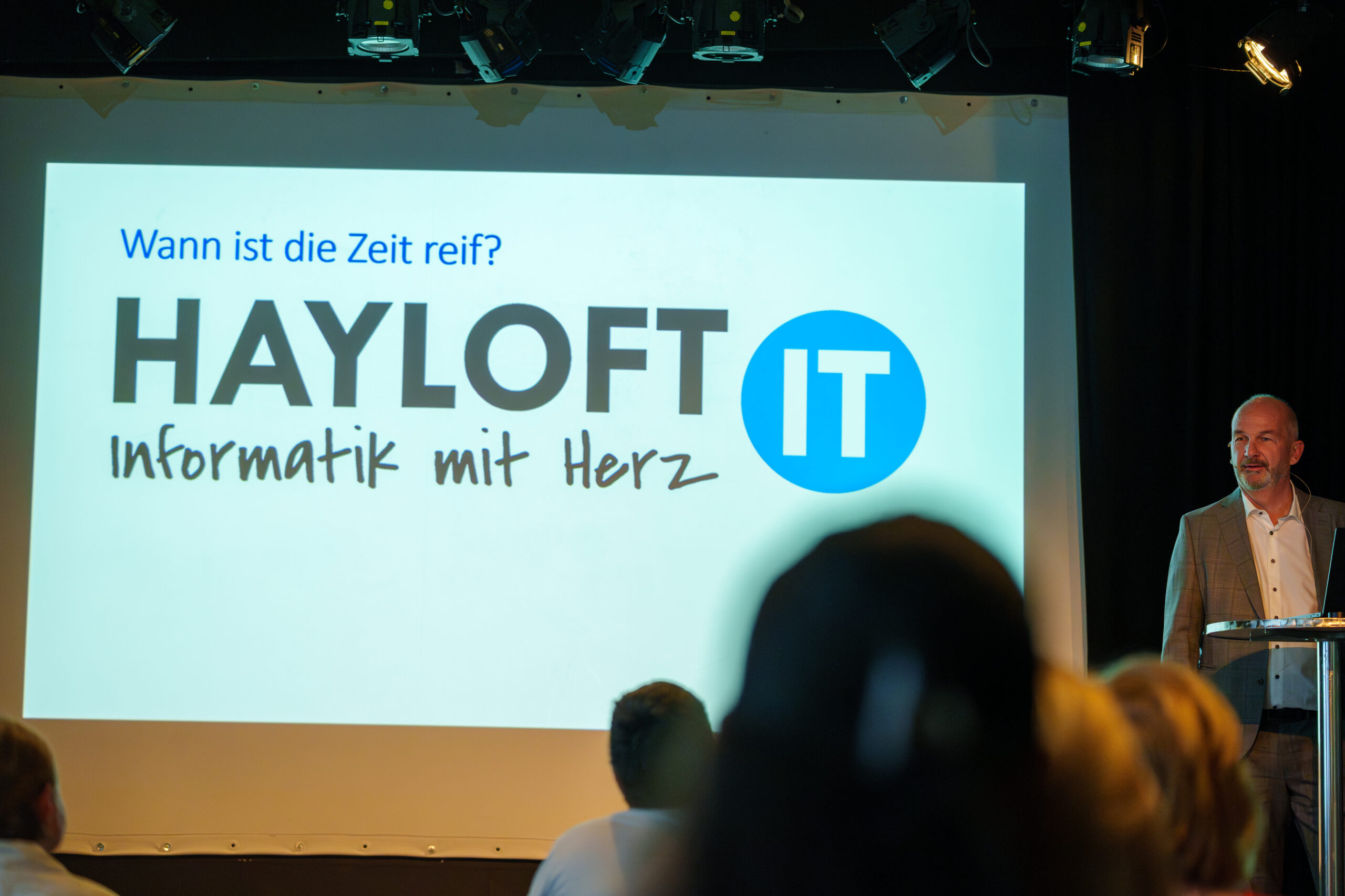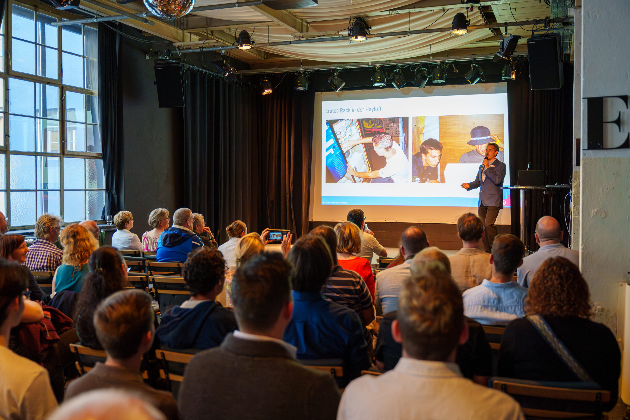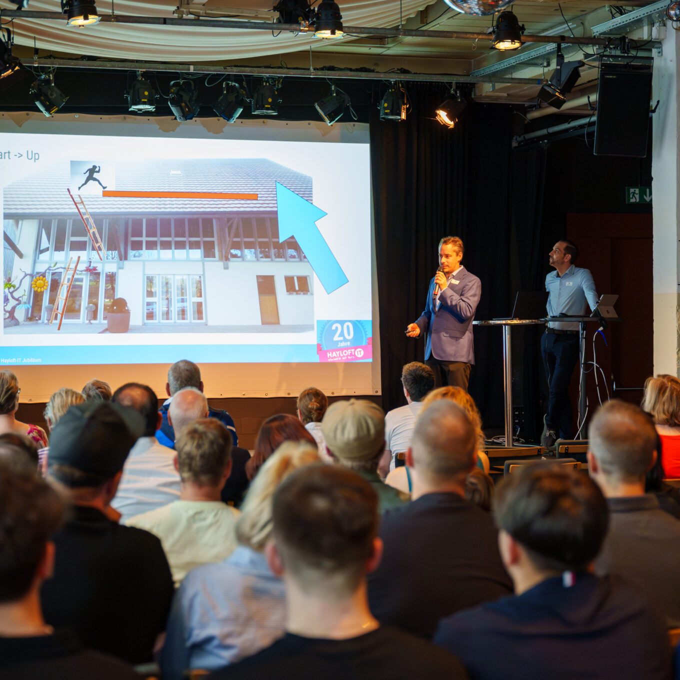 Nach dem Apéro hiessen wir, die Geschäftsführer Reto Schaufelbühl und Matthias Stierli, die Anwesenden zu 20 Jahren Hayloft-IT willkommen und blickten auf unsere Anfänge zurück.