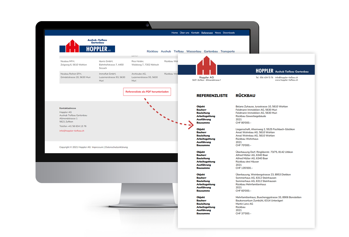 Die Referenzlisten werden zusätzlich als PDF-Dokumente zur Verfügung gestellt. Damit die PDF’s nicht separat erstellt werden müssen, wurde von uns eine Automation programmiert, welche es ermöglicht die Inhalte, welche in WordPress erfasst und administriert werden, automatisch als PDF darzustellen.