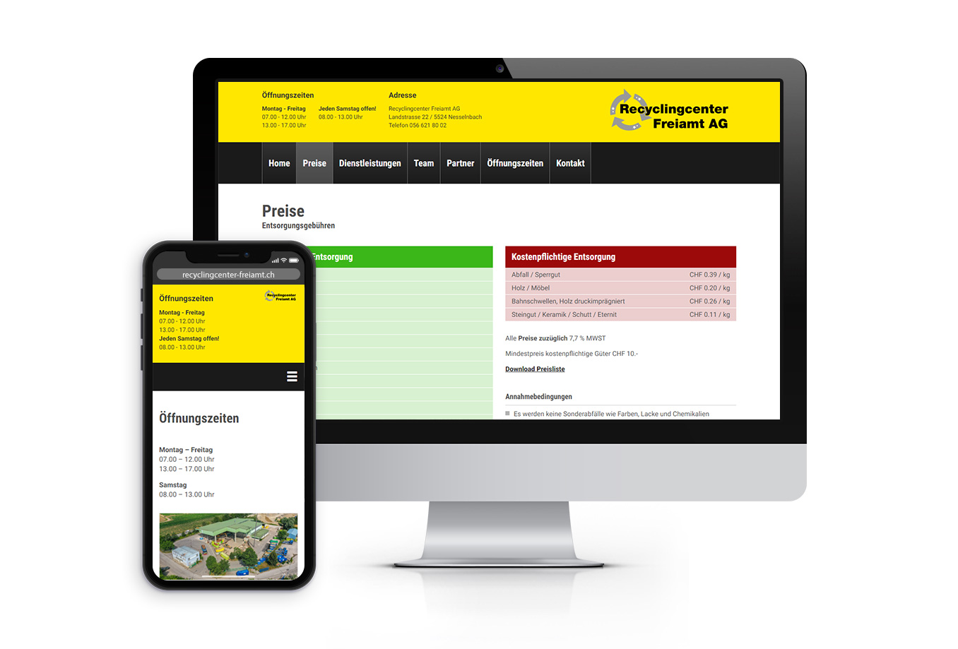 Ziel war es eine technisch aktuelle Website für das Recyclingcenter Freiamt AG zu gestalten, welches auf der Basis von hubschmid-ag.ch basiert (Referenzprojekt anschauen).