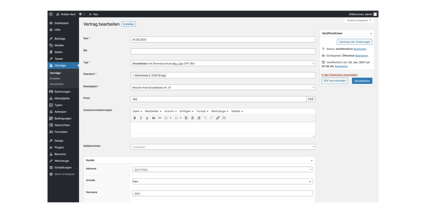 stalder rent AG bekommt neben einer neuen Website noch ein komplexes und in WordPress integriertes System, um Mietobjekte, Kunden, Verträge und Rechnungen zu verwalten.